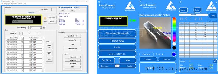 要进一步处理测量数据,您可以将测量设备与移动 Android 和 iOS 设备配对。或者您与 Windows PC 通信。这是通过低功耗蓝牙技术 (BLE) 实现的。使用 Lima Connect 应用程序,您可以管理项目并在照片上分配测量点。测量结果可以统计评估并以图形方式显示。适用于 Android、iOS 和 Windows 的应用程序是免费的。