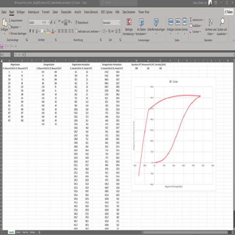在该过程结束时,可以将值传输到 Microsoft Excel。Microsoft Excel 提供 DataStreamer 导入功能,可以直接从控制器传输数据。数学样条函数在 Excel 宏中实现,用于计算并显示准确的磁滞曲线。